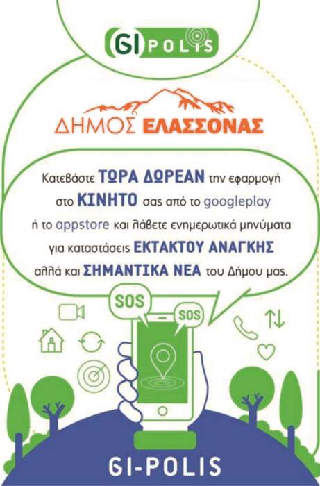Με στόχο την ενημέρωση των δημοτών, σε κάθε περίσταση που κρίνεται επείγουσα ή αναγκαία, ο Δήμος Ελασσόνας προχώρησε σε ένα ακόμα βήμα για την έγκαιρη και έγκυρη ενημέρωση, ενεργοποιώντας την εφαρμογή GI-POLIS, ώστε μέσω αποστολής μηνυμάτων, στις κινητές συσκευές ή στο tablet (Mobile Push Notifications), να λαμβάνουν οι πολίτες άμεσα μηνύματα, ενημερώσεις και έκτακτες ειδοποιήσεις (push notifications) από τις υπηρεσίες του δήμου.