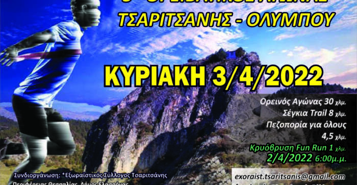 Με τη συμμετοχή κορυφαίων αθλητών θα διεξαχθεί και φέτος ο «5ος Ορειβατικός αγώνας ΤΣΑΡΙΤΣΑΝΗΣ» την Κυριακή 3 Απριλίου 2022 καθώς και αγώνας για παιδιά το Σάββατο 2 Απριλίου 2022 στην κοινότητα Τσαριτσάνης, του Δήμου Ελασσόνας.