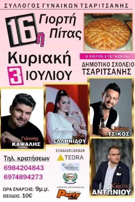 Ο Σύλλογος Γυναικών Τσαριτσάνης διοργανώνει και φέτος για 16η χρονιά την Γιορτή Πίτας. Η εκδήλωση θα πραγματοποιηθεί την Κυριακή 3 Ιουλίου, σε στεγαζόμενο χώρο στον αυλειο χώρο του δημοτικού σχολείου Τσαριτσάνης. Θα εμφανιστούν ο μαναδικός Γιάννης Καψάλης, η Ρία Ελληνίδου, ο Μάκης Τσίκος, ο Κώστας Αντωνίου και ο νικητής του Ελλάδα έχεις ταλέντο Κωνσταντίνος Τσαμαδός.