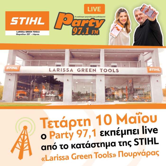 Τετάρτη 10 Μαιου ο Party 97,1 εκμπεμπει ζωντανά 6 με 8 το απογευμα στα εγκαίνια του νέου υποκαταστήματος «Larissa Green Tools» Πουρνάρας, πιστοποιημένου αντιπροσώπου της STIHL