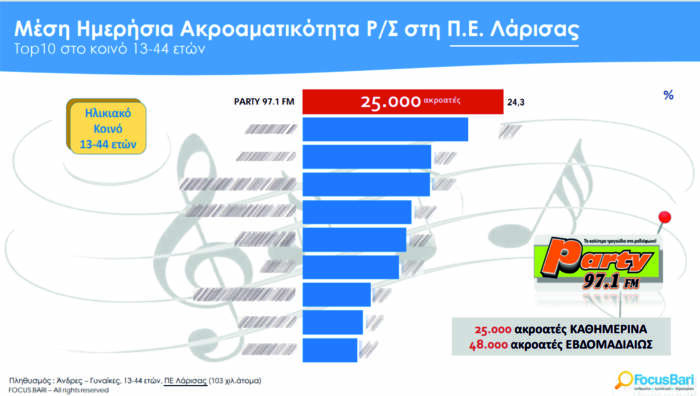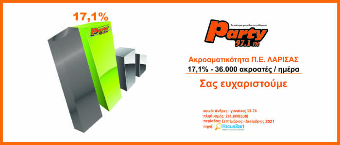 Ο Party Fm 97.1 και πάλι στην κορυφή της ακροαματικότητας με 17,1% σε όλη την Π.Ε. Λάρισας, σε όλες τις ηλικίες (13-74) με 36.000 ακροατές / ημέρα. Ειδικότερα είναι το πρώτο σε ακροαματικότητα ραδιόφωνο σε όλη την Π.Ε. Λάρισας (συνολικά σε ολόκληρο το νομό) με ποσοστό 24,3% (μέση ημερήσια ακρόαση), στις ηλικίες 13 – 44, σύμφωνα με τις επίσημες τελευταίες μετρήσεις της εταιρίας Focus-Bari για το 2021.