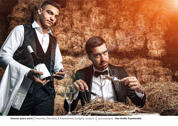 Τον Φεβρουάριο, ο Θανάσης Τσούτσος και ο Σωτήρης Καραπέτσας (γεωργοί) έχουν στήσει ένα απολαυστικό δείπνο μέσα σε έναν στάβλο γεμάτο με δέματα, με τον ένα να τρώει σανό σε ένα πιάτο και τον άλλον να του σερβίρει σαμπάνια.