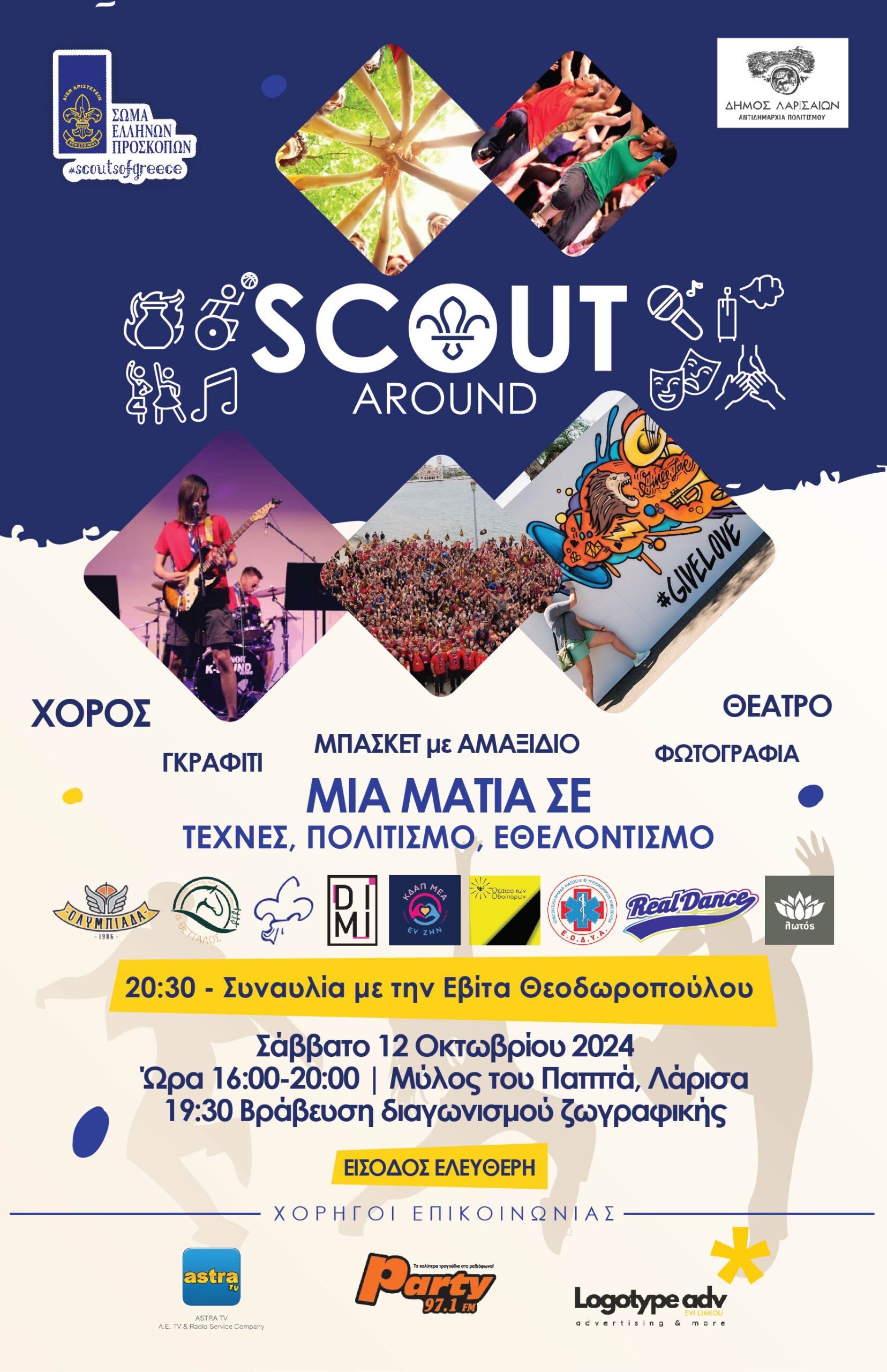 Το φεστιβάλ “Scout Around” που συνδιοργανώνουν οι Πρόσκοποι της Λάρισας και η Αντιδημαρχία Πολιτισμού του Δήμου Λαρισαίων, είναι η μεγάλη γιορτή που θα στηθεί στον Μύλο του Παππά, το Σάββατο 12 Οκτωβρίου και  μπορούν να συμμετέχουν οι νέοι και νέες της πόλης μας και φυσικά όλοι και όλες που νοιώθουν νέοι και νέες.