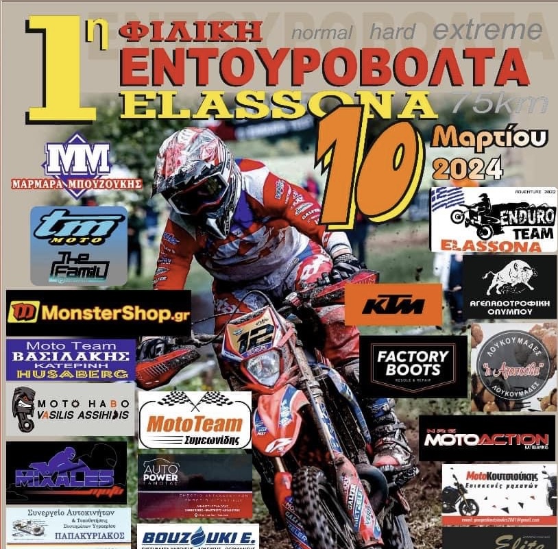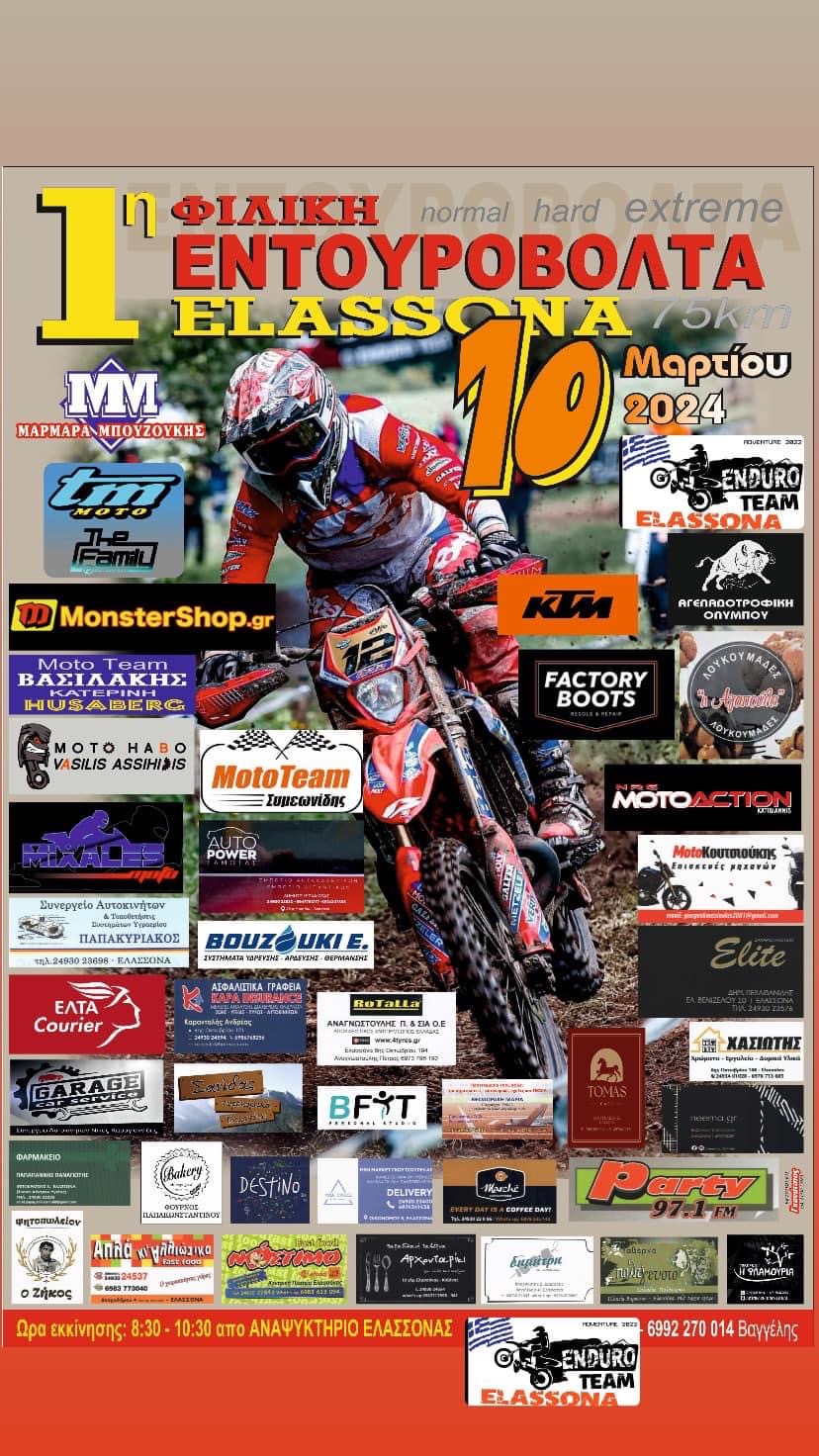Επίσημα πλέον όλα έτοιμα για την πρώτη 1°Εντουροβόλτα Ελασσόνας. Οι διοργανωτές θέλουν να ευχαριστήσουμε όλους τους χορηγούς ξεχωριστά έναν έναν για την στήριξη που δείχνουν. Λίγα λόγια για την διαδρομή όπου είναι απαιτητική όσοι συμμετάσχουν στην βόλτα θα πρέπει να έχουν καινούργια λάστιχα και ολοκληρωμένο εξοπλισμό. Η διαδρομή είναι 75 χιλιόμετρα χαρτογραφημένη και απαιτητική θα υπάρχει διαδρομή normal, hard και extreme. Ώρα εκκίνησης θα είναι 8:30 μέχρι 10:30 το αργότερο. Ραντεβου λοιπόν την Κυριακή  10-3-2024. Τηλέφωνα για πληροφορίες (Σωτήρης 6983748814-6909098579). *Με την υποστήριξη του Party 97,1