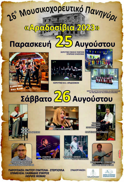 Την Παρασκευή 25 Αυγούστου θα παρουσιάσει το πρόγραμμά του το δεκαμελές συγκρότημα των Σαμολαδαίων (Samoladay-full band), η χορευτική ομάδα του Δικτύου Καλλιτεχνών και Επιστημόνων για την ανάπτυξη της Επαρχίας Ελασσόνας, και τα χορευτικά συγκροτήματα της Ένωσης Ποντίων Ελασσόνας και του Μ. Σ. Αραδοσιβίων.