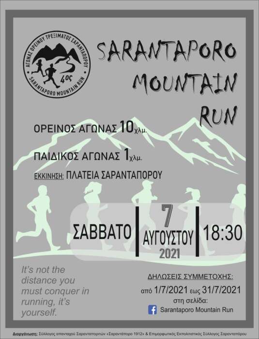 Η οργανωτική επιτροπή του αγώνα ΄΄SARANTAPORO MOUNTAIN RUN’’ ύστερα από συνεχή επικοινωνία με την Γενική Γραμματεία Αθλητισμού και τον ΣΕΓΑΣ, όπως επίσης λαμβάνοντας υπόψιν την επιτυχία και το αντίκτυπο του αγώνα στην τοπική κοινωνία, αποφάσισε την διεξαγωγή του την Σάββατο 7 Αυγούστου 2021.
