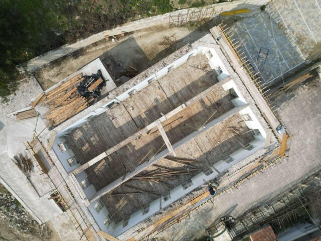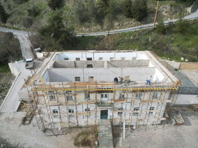 Ήδη τις τελευταίες μέρες έχει αποκαλυφθεί η στέγη του κτιρίου, η οποία θα αντικατασταθεί με νέα, και έχουν γίνει οι καθαιρέσεις των παλαιών επιχρισμάτων.