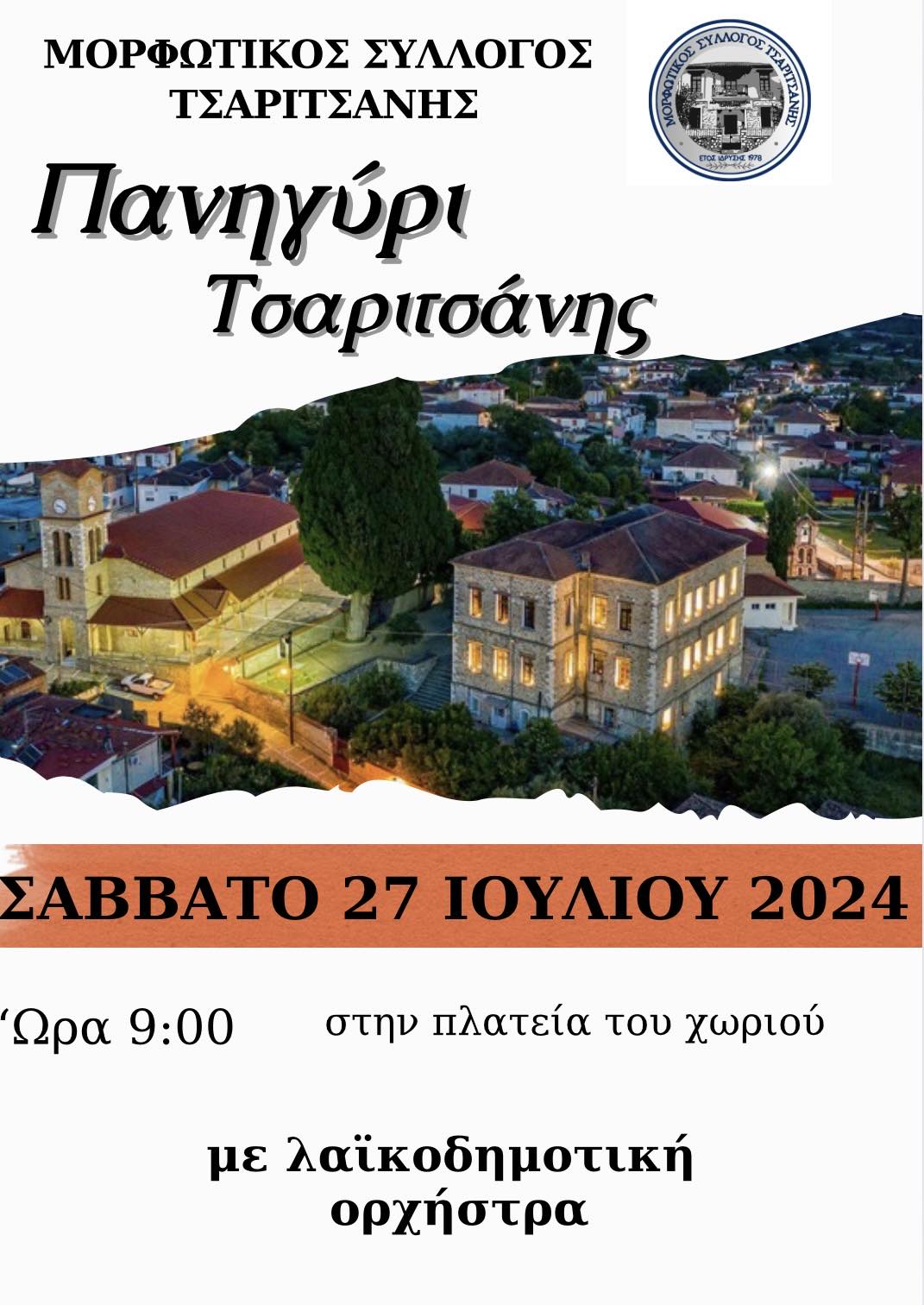 Παραδοσιάκο Πανηγύρι με λαϊκοδημοτική ορχήστρα διοργανώνει ο Μορφωτικός Σύλλογος Τσαριτσάνης