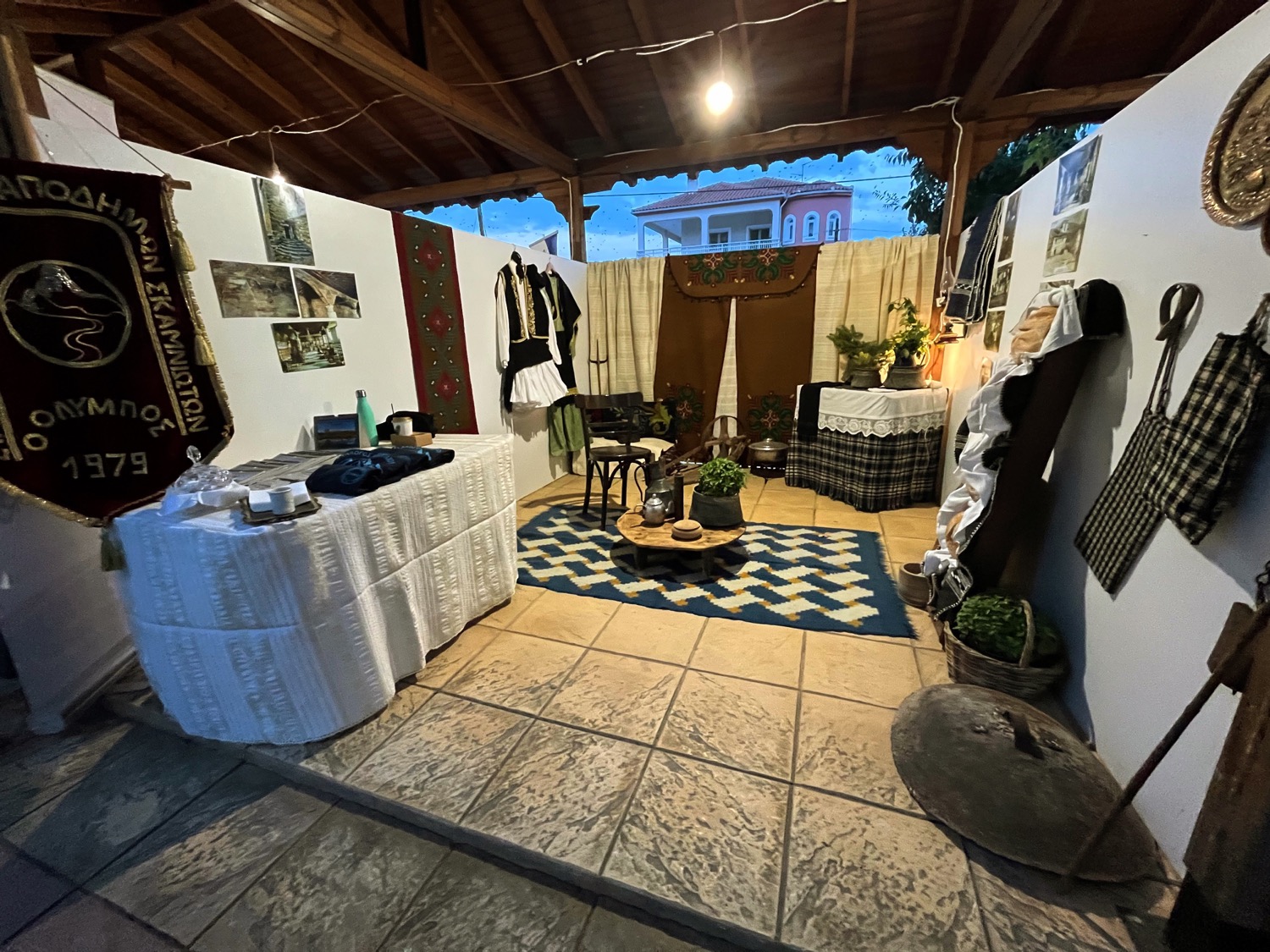 Σημαντικά τα αντικείμενα της έκθεσης στο περίπτερο, για να καταδείξουν μια εικόνα της ζωής στην ορεινή Σκαμνιά. Κάποια από τα αντικείμενα τα συναντάμε σε πολλούς ορεινούς και μη ορεινούς τόπους στις περασμένες δεκαετίες όπως το κλειδοπίνακο (ξύλινο δοχείο για το τυρί που έπαιρναν μαζί τους οι κτηνοτρόφοι), οι τράκες (μεγάλα κουδούνια) και τα τρακάλια (μικρά κουδούνια) για γιδοπρόβατα και αγελάδες, οι μπακράτσες και τα μπακρατσούλια, τα γκιούμια, το τσαγερό, οι λάμπες πετρελαίου, τα στεφάνια (ξύλινο βραχιόλι στο λαιμό των ζώων στο οποίο περνούσαν κουδούνι), το τσικρίκι για τη δημιουργία της κλωστής από το μαλλί, η ρόκα (καλλιτεχική και απλή από κομμένο φυσικό σχήμα), οι βελέντζες από γιδόμαλλο, ο σοφράς (το χαμηλό τραπέζι), τα μάλλινα ζωγραφιστά μαξιλάρια, τα μάλλινα πατάκια, τα μαλλινοσέντονα για το καλοκαίρι, το πινακωτό με το μάλλινο και πάνινο ύφασμα για την ωρίμανση του ψωμιού…