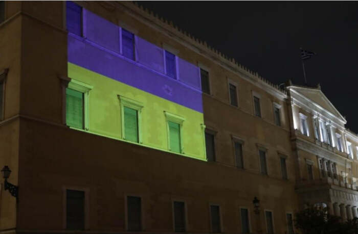 Στα χρώματα της ουκρανικής σημαίας φωταγωγήθηκε το βράδυ της Παρασκευής, 25 Φεβρουαρίου, το σιντριβάνι της πλατείας Ομονοίας και το κτίριο της Τεχνόπολης.