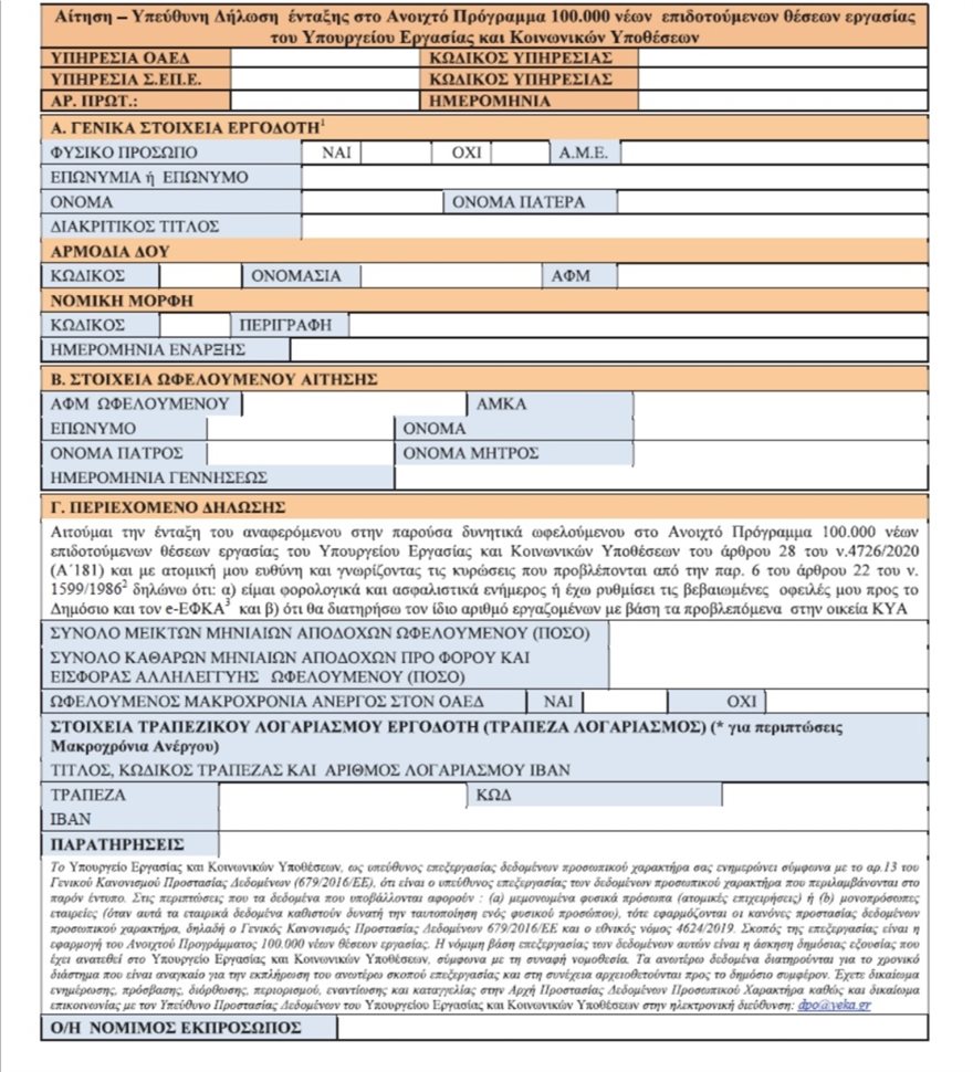 –Υποβολή ξεχωριστής ηλεκτρονικής αίτησης – υπεύθυνης δήλωσης για κάθε εργαζόμενο που προσλαμβάνεται και εντάσσεται στο πρόγραμμα. Η αίτηση υποβάλλεται με το ειδικό έντυπο «Αίτηση- Υπεύθυνη Δήλωση ένταξης στο ανοικτό πρόγραμμα 100.000 νέων επιδοτούμενων θέσεων εργασίας του Υπουργείου Εργασίας και Κοινωνικών Υποθέσεων», στο πληροφοριακό σύστημα «Εργάνη». Στην αίτηση που υπέχει θέση υπεύθυνης δήλωσης, δηλώνονται τα στοιχεία της επιχείρησης, τα στοιχεία του δυνητικά ωφελούμενου, οι μηνιαίες μεικτές και οι αντίστοιχες καθαρές, προ φόρου και ειδικής εισφοράς αλληλεγγύης, αποδοχές του. Με την ίδια αίτηση δηλώνεται εάν ο ωφελούμενος είναι μακροχρόνια άνεργος, όπως επίσης η τράπεζα και το IBAN της επιχείρησης (μόνο αν η επιχείρηση αιτείται να προσλάβει μακροχρόνια άνεργο), ότι η επιχείρηση είναι φορολογικά και ασφαλιστικά ενήμερη ή έχει ρυθμίσει βεβαιωμένες οφειλές και τέλος ότι θα διατηρήσει κατά μέσο όρο τον ίδιο αριθμό εργαζομένων για το χρονικό διάστημα των έξι μηνών, κατά το οποίο επιδοτείται η νέα θέση εργασίας.