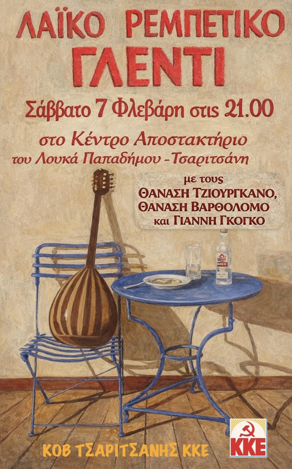 Ρεμπέτικο-Λαϊκό γλέντι διοργανώνει η ΚΟΒ Τσαριτσάνης του ΚΚΕ το Σάββατο 7 Φεβρουαρίου στις 21.00 στο κέντρο «Αποστακτήριο» του Λουκά Παπαδήμου.