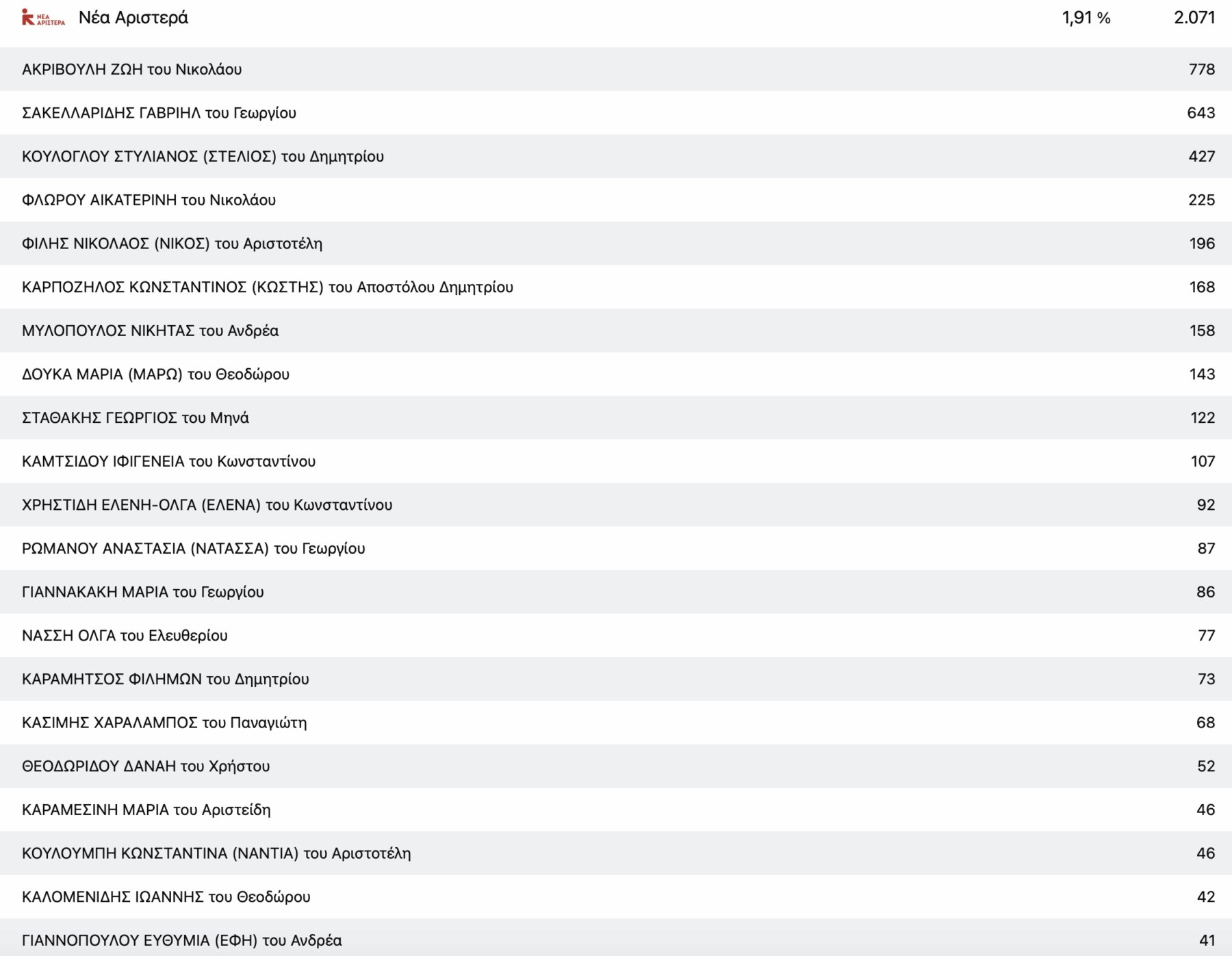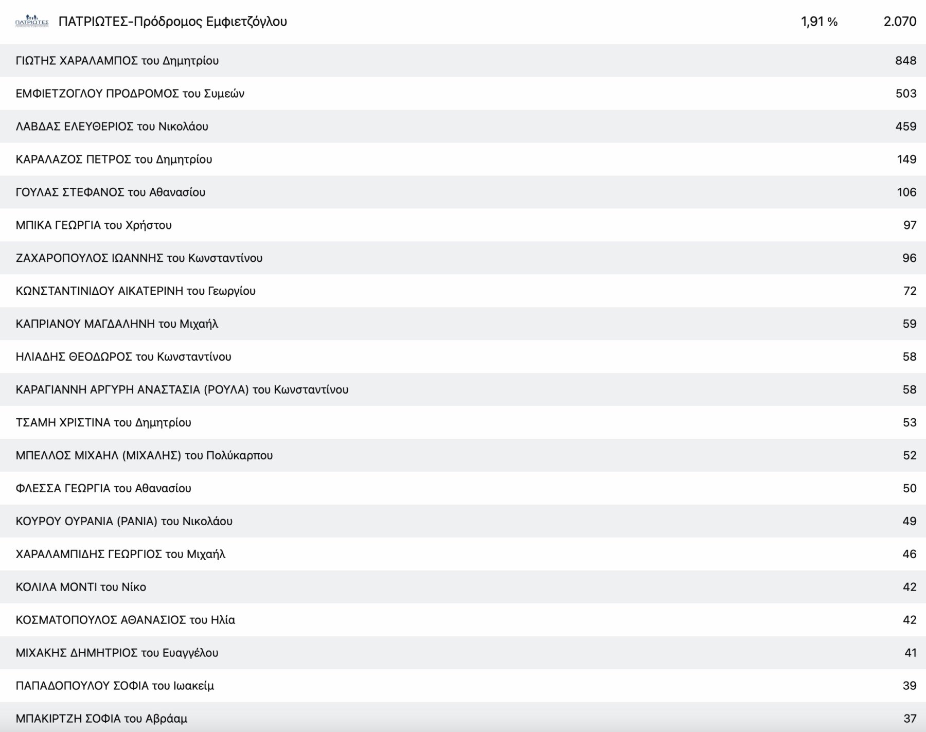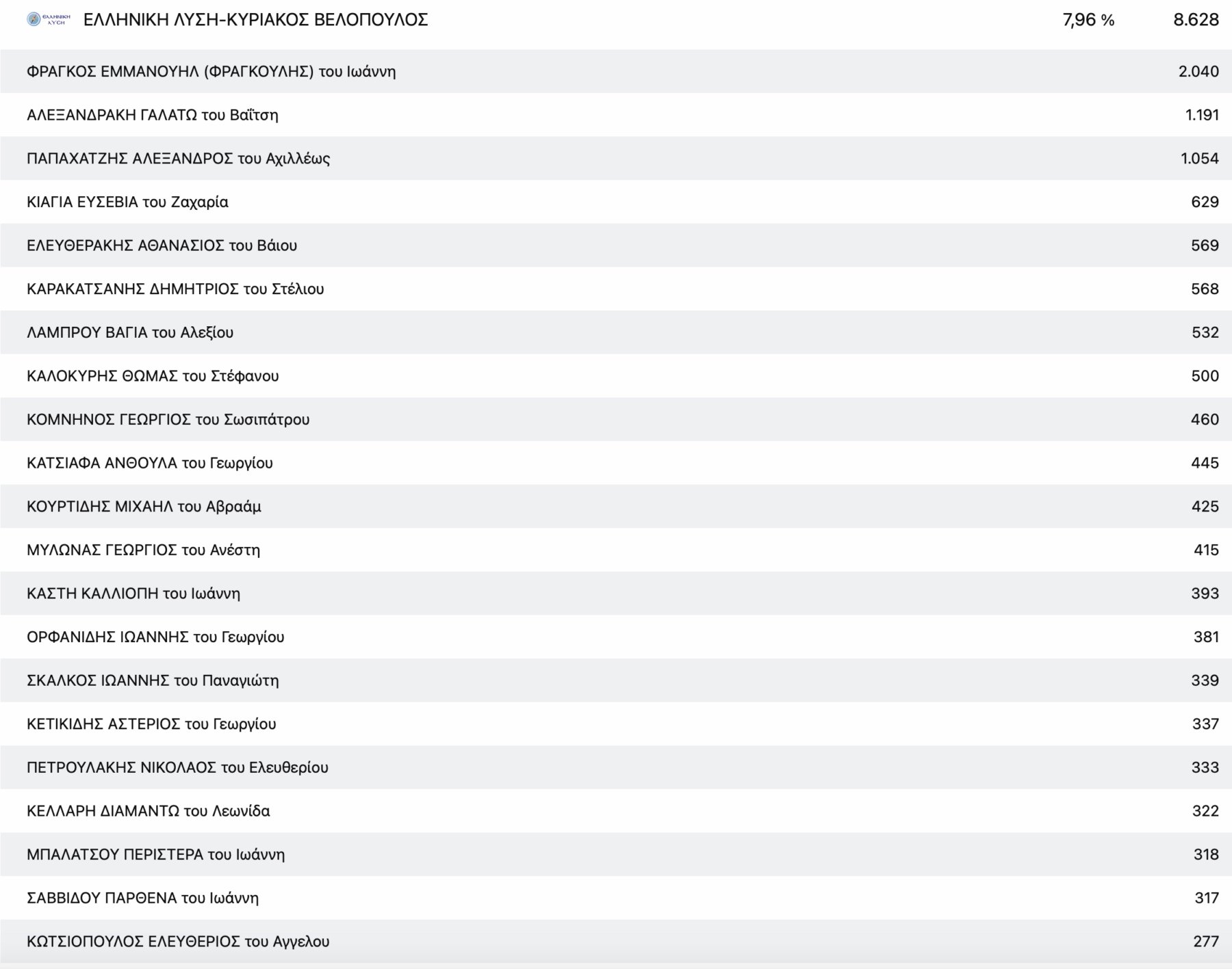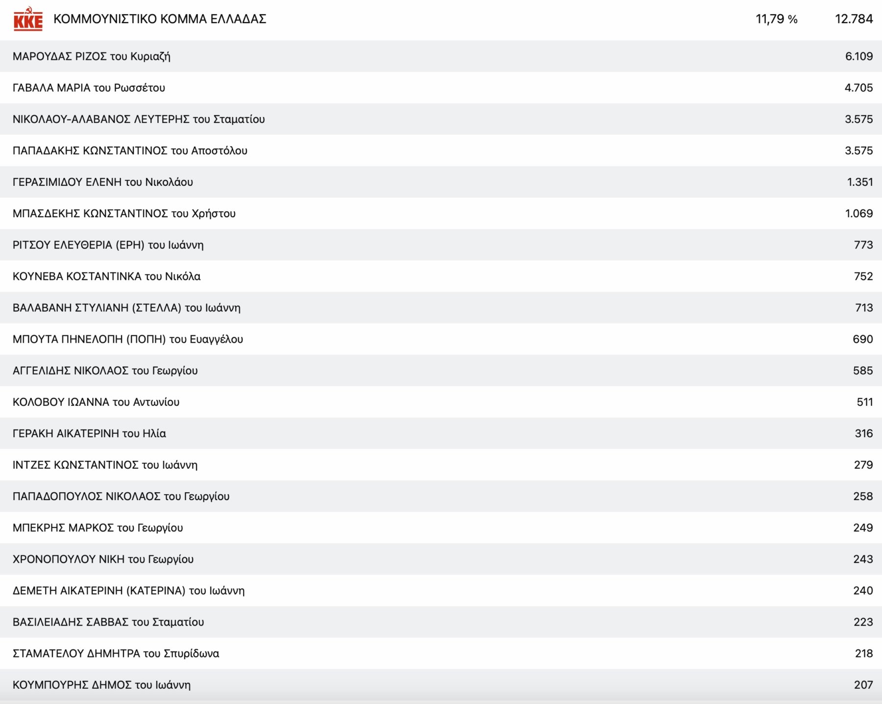 Στο ΚΚΕ με μεγάλη διαφορά από τη δεύτερη Μαρία Γαβαλά, τερμάτισε πρώτος ο πρόεδρος της Ενωτικής Ομοσπονδίας Αγροτικών Συλλόγων νομού Λάρισας Ρίζος Μαρούδας και στην Ελληνική Λύση ο απόστρατος στρατηγός Φράγκος Φραγκούλης.
