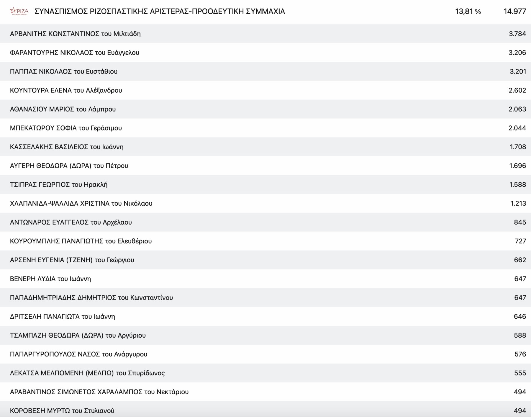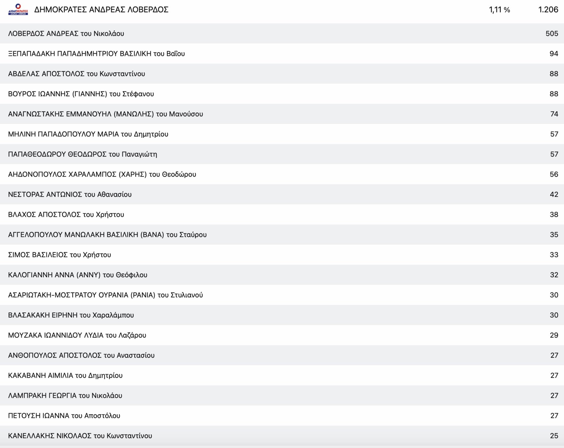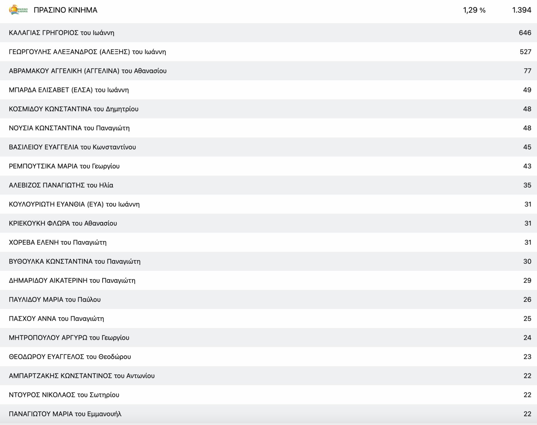 Στο ΚΚΕ με μεγάλη διαφορά από τη δεύτερη Μαρία Γαβαλά, τερμάτισε πρώτος ο πρόεδρος της Ενωτικής Ομοσπονδίας Αγροτικών Συλλόγων νομού Λάρισας Ρίζος Μαρούδας και στην Ελληνική Λύση ο απόστρατος στρατηγός Φράγκος Φραγκούλης.
