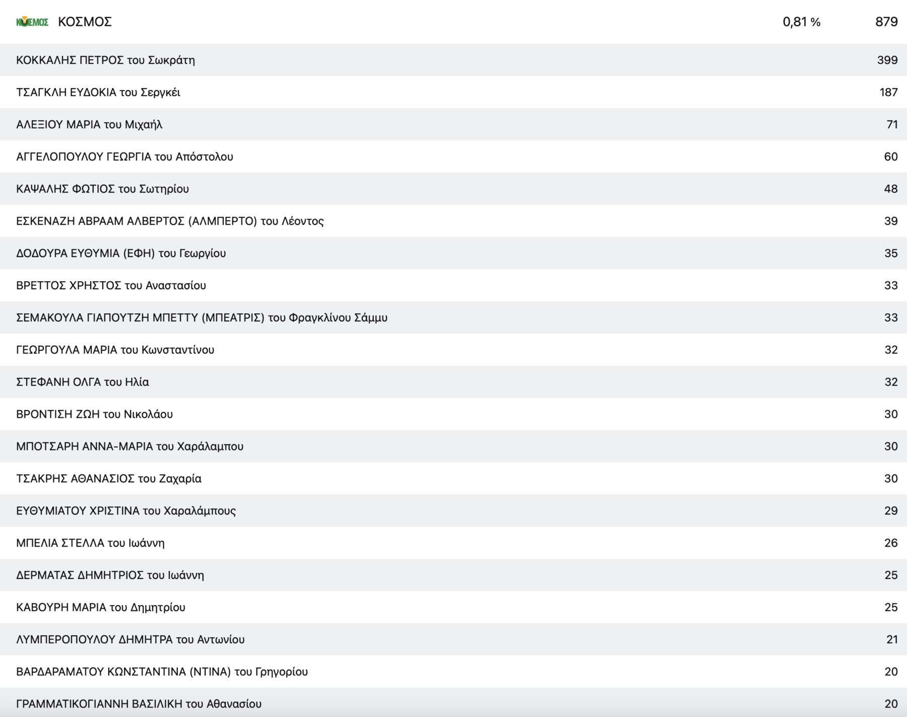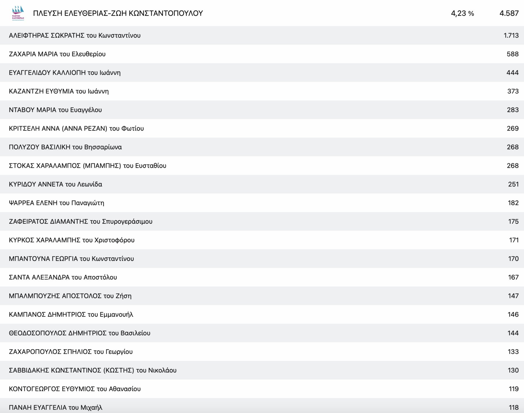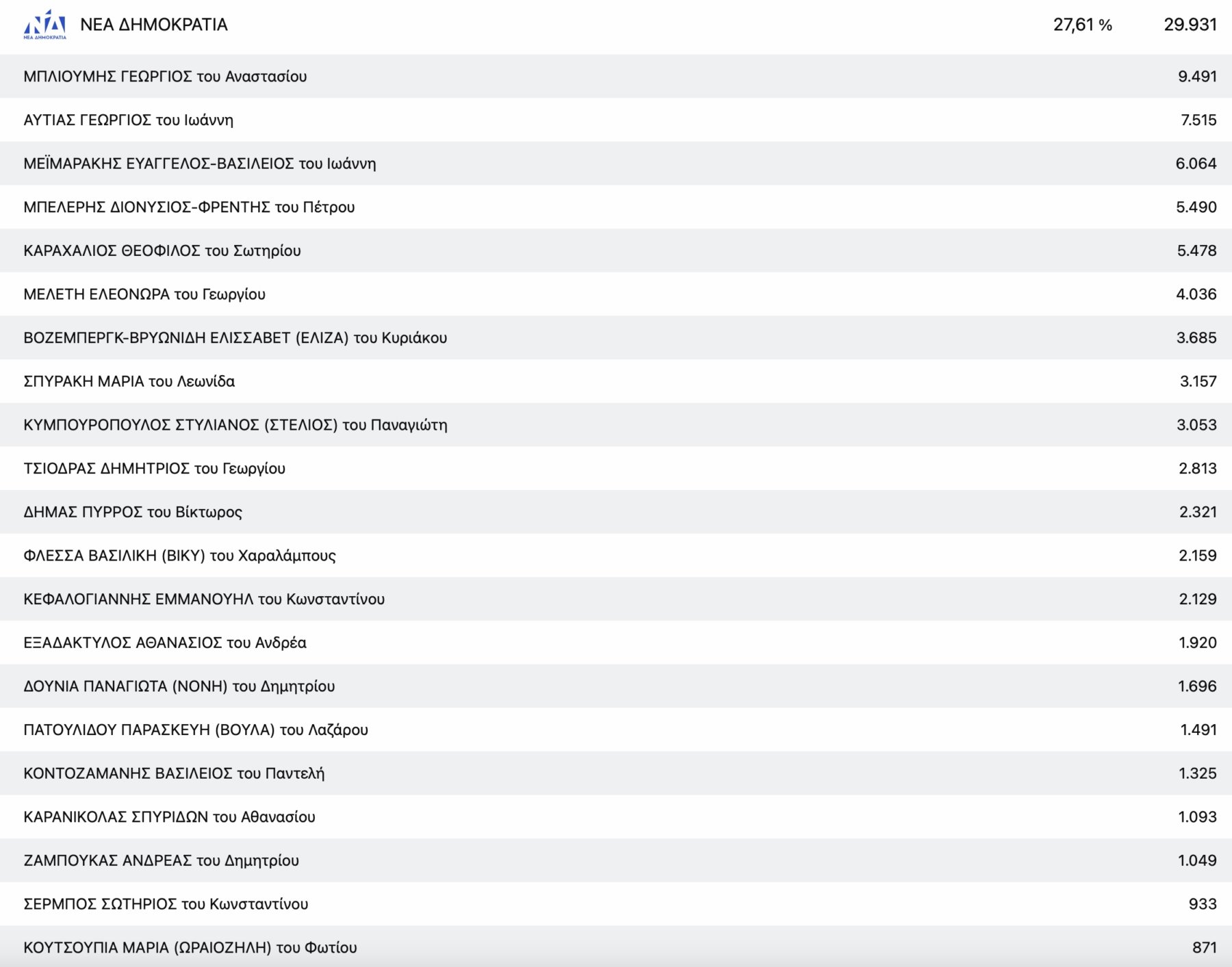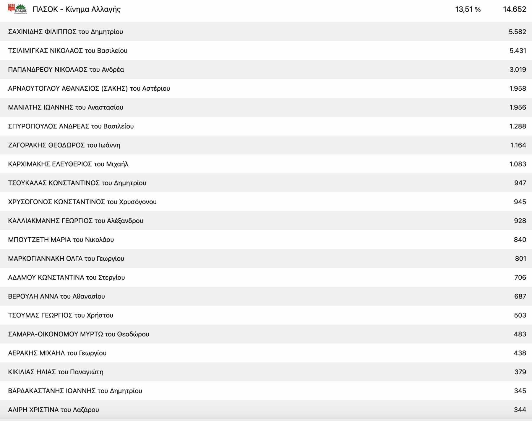 Στο ΚΚΕ με μεγάλη διαφορά από τη δεύτερη Μαρία Γαβαλά, τερμάτισε πρώτος ο πρόεδρος της Ενωτικής Ομοσπονδίας Αγροτικών Συλλόγων νομού Λάρισας Ρίζος Μαρούδας και στην Ελληνική Λύση ο απόστρατος στρατηγός Φράγκος Φραγκούλης.