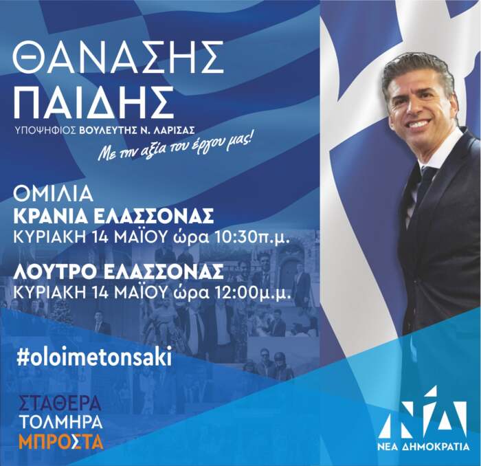 Την Κρανια και το Λουτρο θα επισκεφθεί το πρωί της Κυριακής 14 Μαίου ο υποψήφιος βουλευτής της Ν.Δ. Σακης Παιδης. Συγκεκριμενα θα βρισκεται στις 10.30 στην Κρανεα Ελασσονας και στις 12.00  στο Λουτρο.