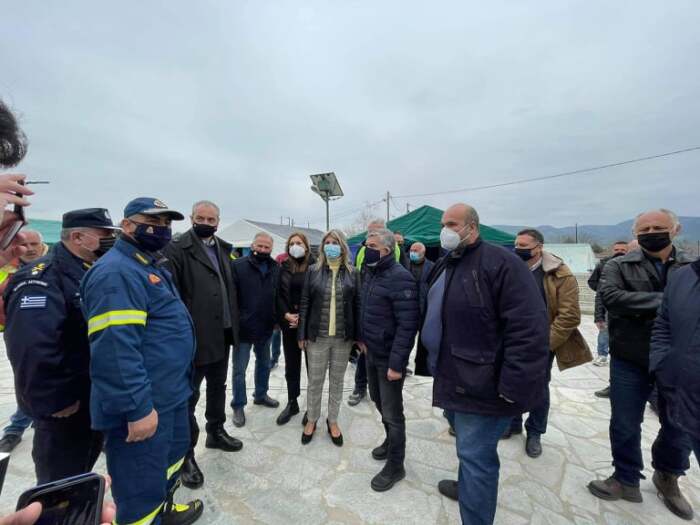 Στο σεισμόπληκτο Βλαχογιάννι επισκεφτηκε το χώρο όπου έχουν τοποθετηθεί οι σκηνές για τη διαμονή των σεισμόπληκτων κατοίκων της κοινότητας και να επιθεωρήσει το κατεστραμμένο από το σεισμό Δημοτικό Σχολείο Βλαχογιαννίου, στο οποίο φοιτούν πάνω από 70 μαθητές.