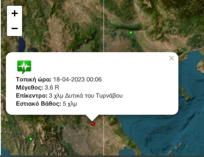 Σεισμική δόνηση 3,6  βαθμών της κλίμακας Ρίχτερ καταγράφηκε  στις 12.06 τα ξημερώματα. 3 χλμ  Δυτικά  του Τυρνάβου, με εστιακό βάθος 5 χλμ.