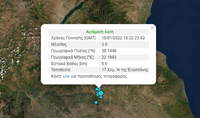Σεισμός σημειώθηκε στην Ελασσόνα 22′ λεπτά μετά τις 8 το βράδυ του Σαββάτου (15.01.2022). Η δόνηση είναι επιφανειακή, καθώς το εστιακό της βάθος βρίσκεται μόλις στα 5 χιλιόμετρα, σύμφωνα με το Γεωδυναμικό Ινστιτούτο του Εθνικού Αστεροσκοπείου Αθηνών.
