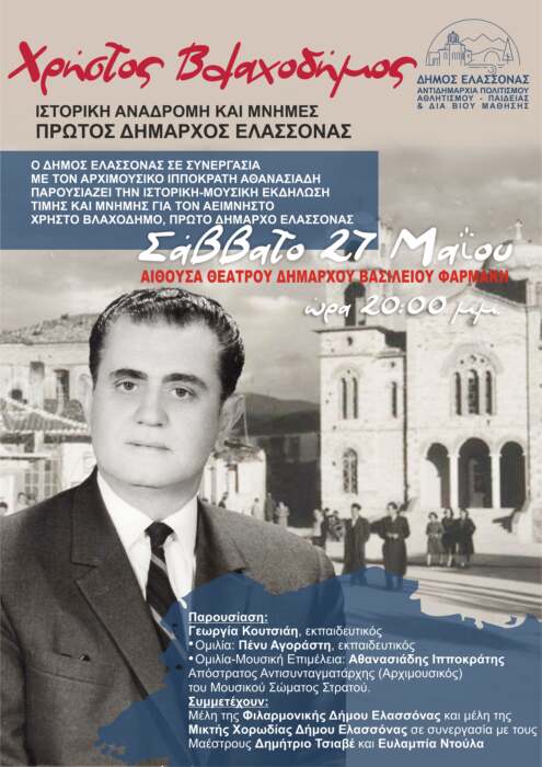 Ο Δήμος Ελασσόνας παρουσιάζει την Ιστορική – Μουσική Εκδήλωση τιμής και μνήμης για τον αείμνηστο Χρήστο Βλαχοδήμο, πρώτο Δήμαρχο Ελασσόνας, μετά από πρωτοβουλία του Αρχιμουσικού του Μουσικού Σώματος Στρατού, κου Ιπποκράτη Αθανασιάδη,σήμερα Σάββατο 27 Μαΐου 2023 και ώρα 8 μ.μ. στην αίθουσα Θέατρου Δήμαρχου Βασιλείου Φαρμάκη.