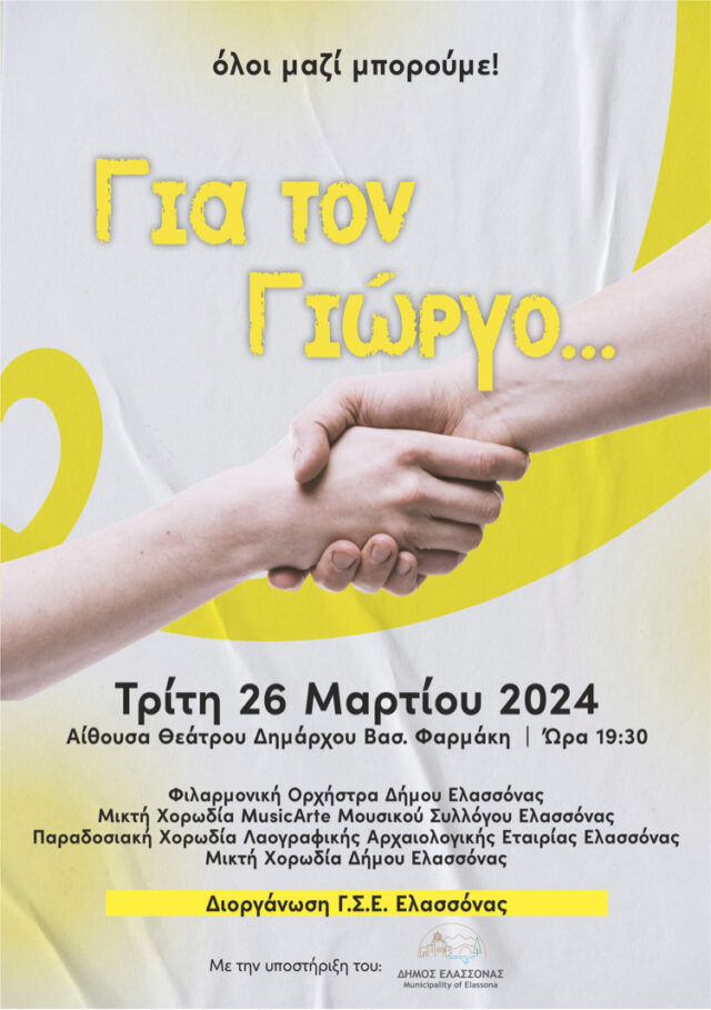 Ο Γ.Σ.Ε. Ελασσόνας υπό την αιγίδα του Δήμου Ελασσόνας, διοργανώνει μουσική φιλανθρωπική παράσταση σήμερα Τρίτη 26 Μαρτίου και ώρα 19:30 στην Αίθουσα Θεάτρου Δημάρχου Βασ. Φαρμάκη, συμπαραστεκόμενος στο πρόβλημα υγείας που αντιμετωπίζει ο προπονητής του συλλόγου Γιώργος Τσανοσίδης.