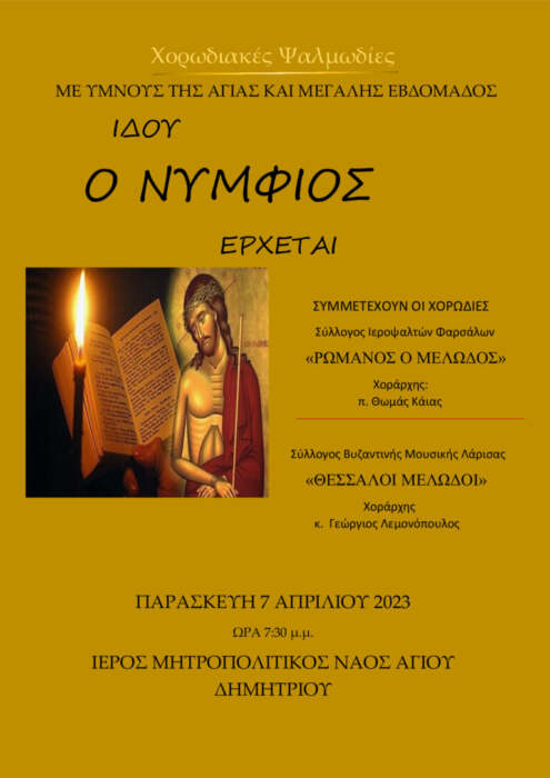 Την Παρασκευή 7 Απριλίου 2023 και ώρα 7.30 μ.μ. στον Ιερό Μητροπολιτικό Ναό Αγίου Δημητρίου Ελασσόνας.