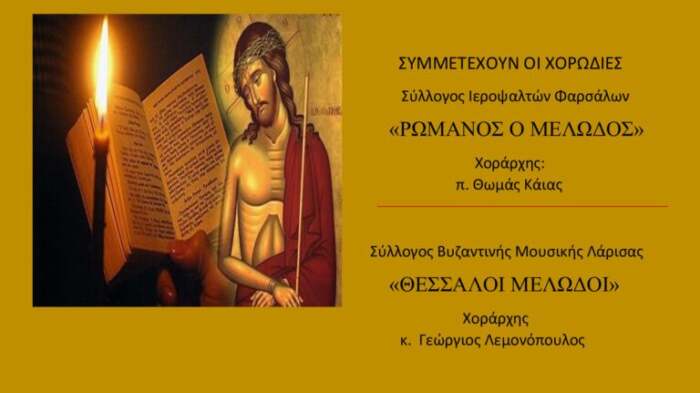 Συμμετέχουν οι χορωδίες: Σύλλογος Ιεροψαλτών Φαρσάλων «Ρωμανός ο Μελωδός» (χοράρχης: π. Θωμάς Κάιας), Σύλλογος Βυζαντινής Μουσικής Λάρισας «Θεσσαλοί Μελωδοί» (Χοράρχης κ. Γεώργιος Λεμενόπουλος).