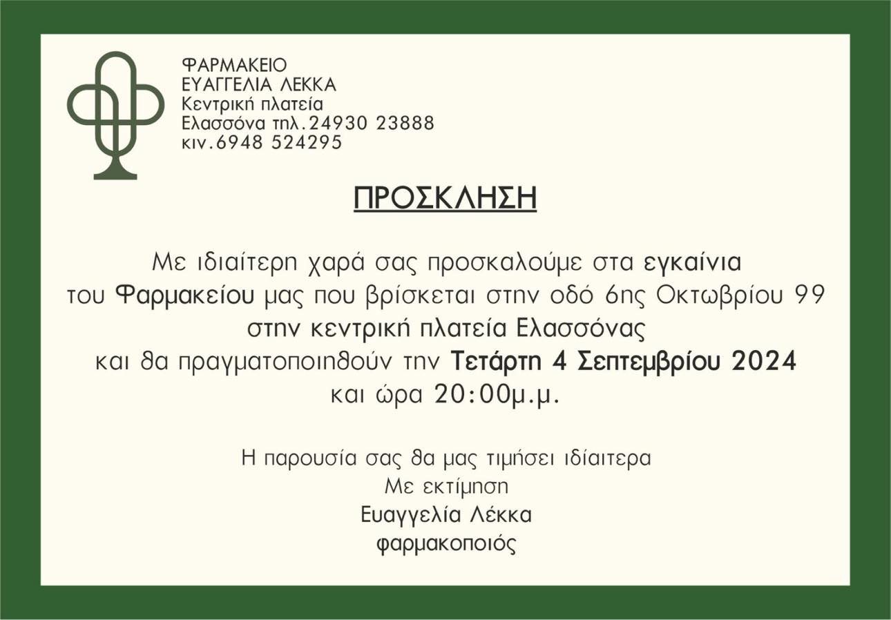 Σήμερα Τετάρτη 4 Σεπτεμβρίου στις 20:00 μμ , θα εγκαινιαστεί το φαρμακείο της Ευαγγελίας Λέκκα, στην οδό 6ης Οκτωβρίου 99 στην κεντρική πλατεία Ελασσόνας. Δείτε την πρόσκληση:
