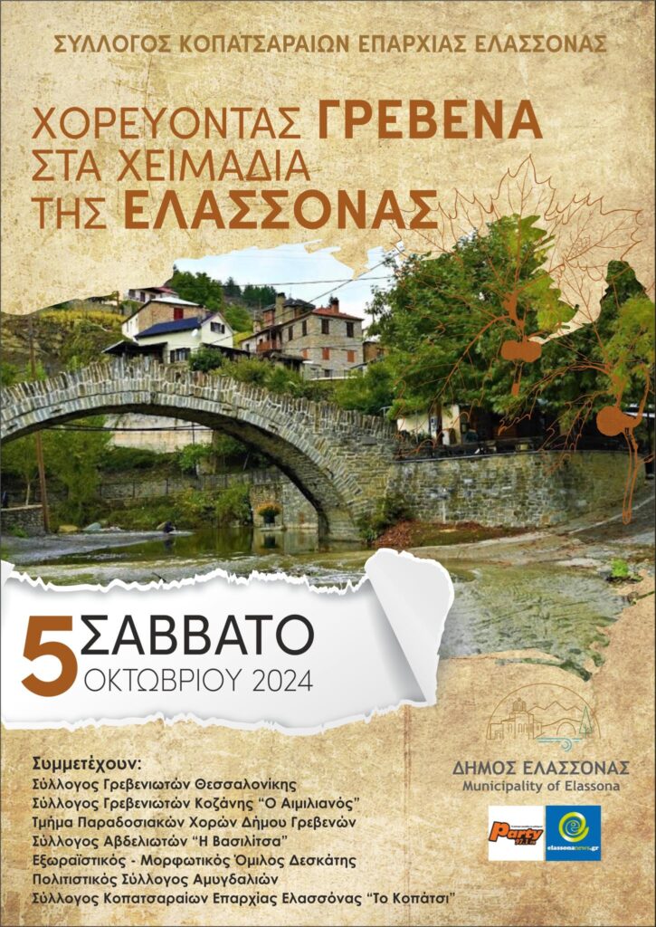 Στο πλαίσιο των πολιτιστικών εκδηλώσεων για την 112η επέτειο απελευθέρωσης της πόλης και της επαρχίας Ελασσόνας, ο Δήμος Ελασσόνας διοργανώνει με το Σύλλογο Απανταχού Κοπατσαραίων Επαρχίας Ελασσόνας «Το Κοπάτσι» ένα μεγάλο μουσικοχορευτικό αντάμωμα το σήμερα Σάββατο 5 Οκτωβρίου στην Κεντρική Πλατεία Ελασσόνας. Στο αντάμωμα συμμετέχουν επτά σύλλογοι με τα χορευτικά τους συγκροτήματα, που θα παρουσιάσουν χορούς εμπνευσμένους από την περιοχή των Γρεβενών και την πλούσια παράδοση των Κοπατσαραίων.