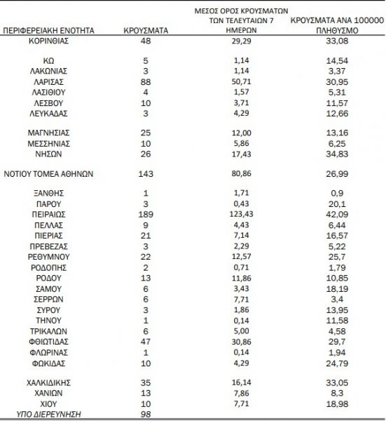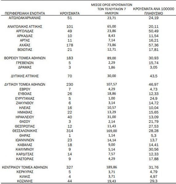 Με βάση τα επιβεβαιωμένα κρούσματα των τελευταίων 7 ημερών, 63 θεωρούνται σχετιζόμενα με ταξίδι από το εξωτερικό και 2.419 είναι σχετιζόμενα με ήδη γνωστό κρούσμα.