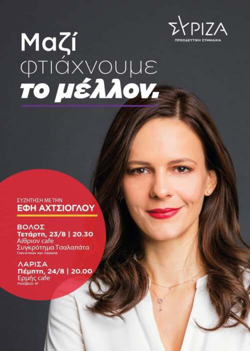 Την Πέμπτη 24/8 η υποψήφια Πρόεδρος του ΣΥΡΙΖΑ – Προοδευτική Συμμαχία, Έφη Αχτσιόγλου θα επισκεφθεί τη Λάρισα, όπου στις  20:00 θα συμμετάσχει σε ανοιχτή συζήτηση με μέλη και φίλους του κόμματος στο καφέ Ερμής, Ρούζβελτ 41.