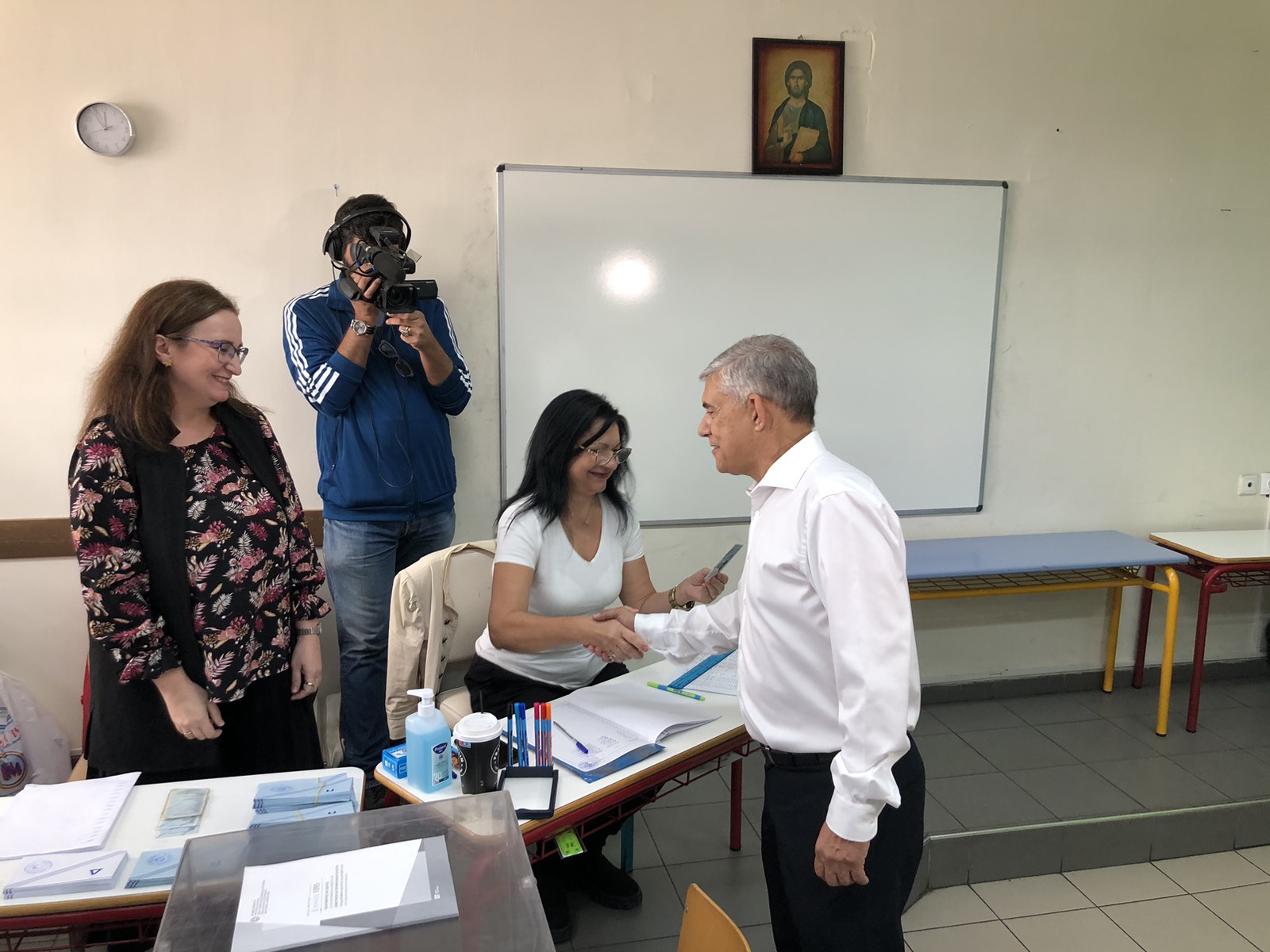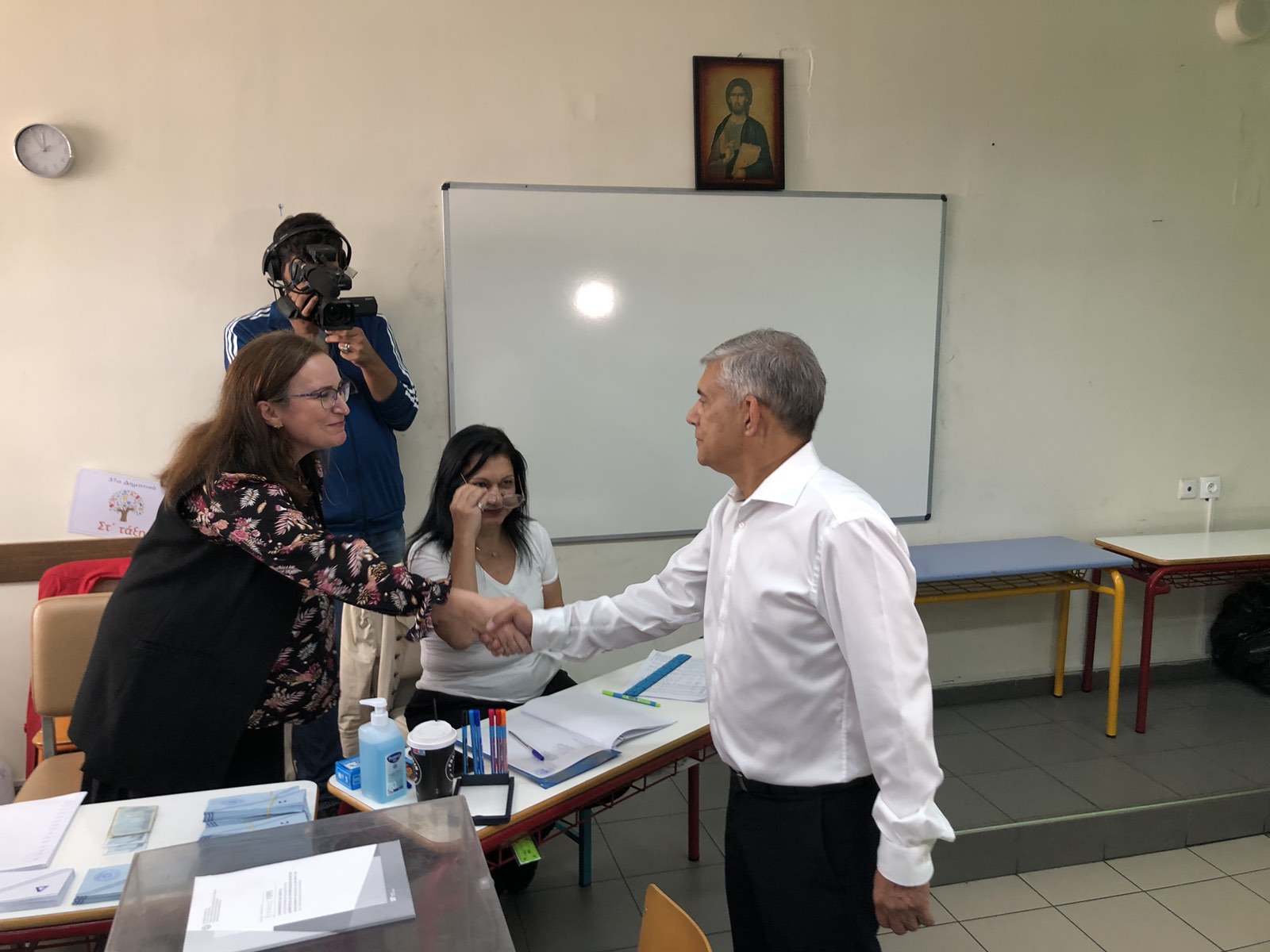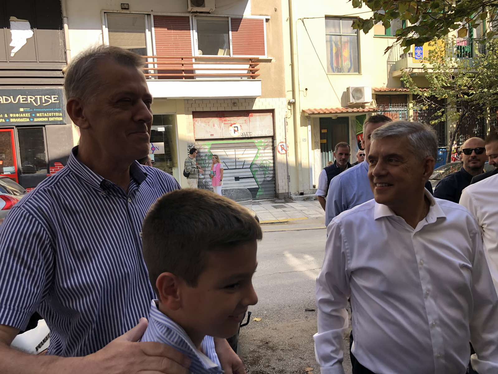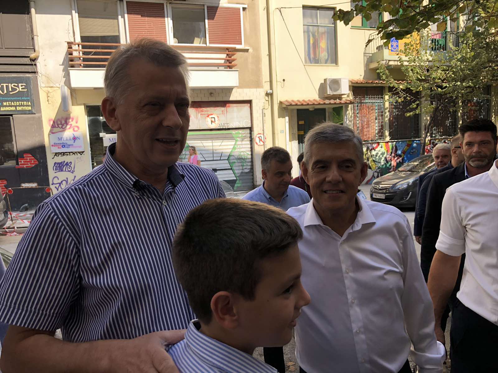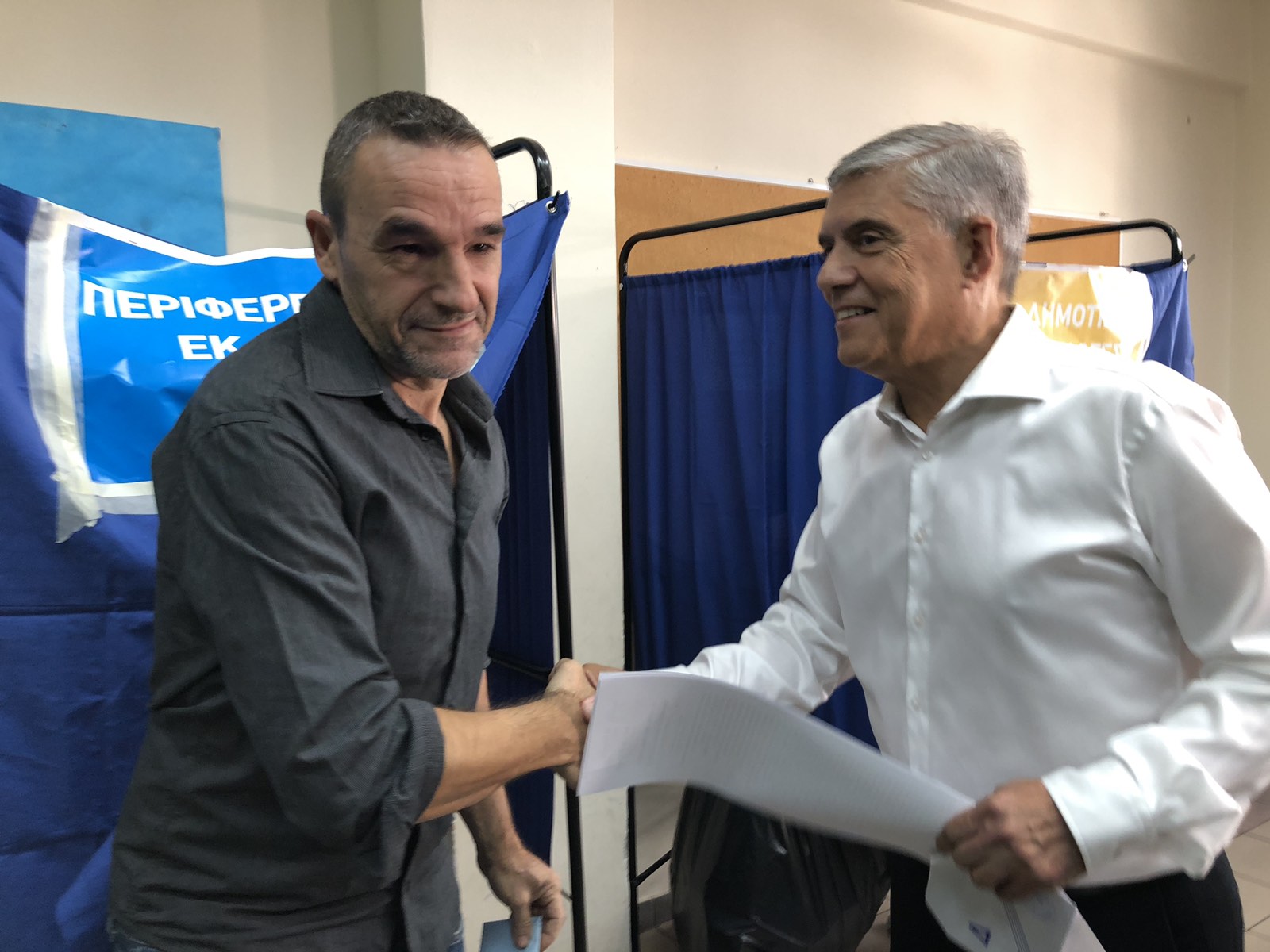 Ο περιφερειάρχης στην αποχώρηση του από το 4ο Δημοτικό Σχολείο συναντήθηκε με τον υποψήφιο περιφερειάρχη Θεσσαλίας κ. Τάσο Τσιαπλέ, με τον οποίο κι αντάλλαξε χειραψία.