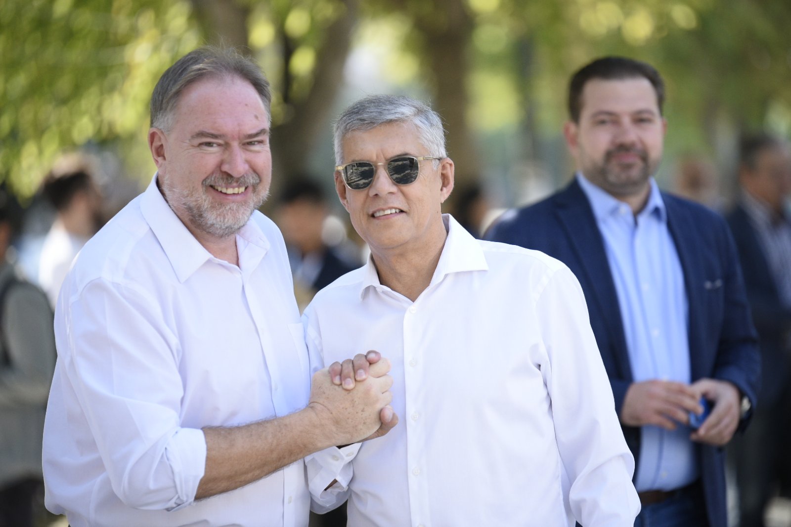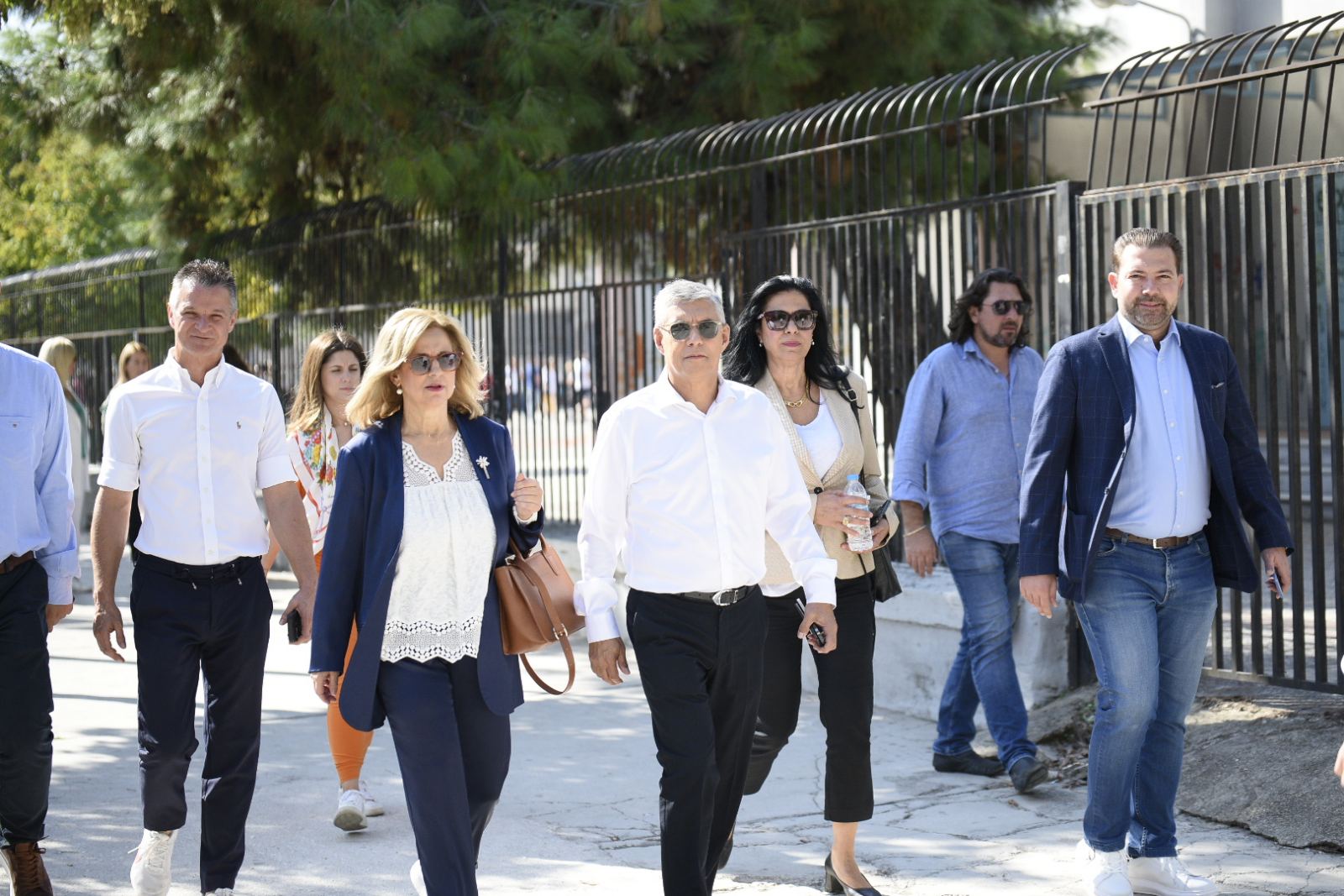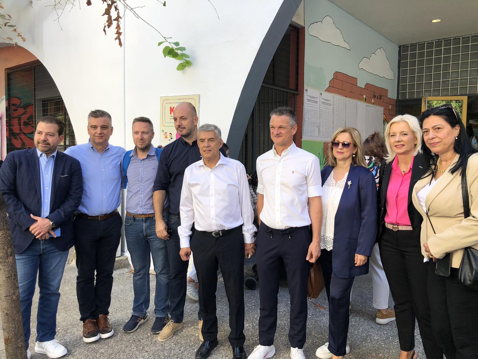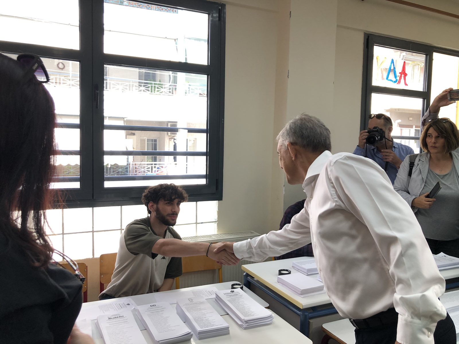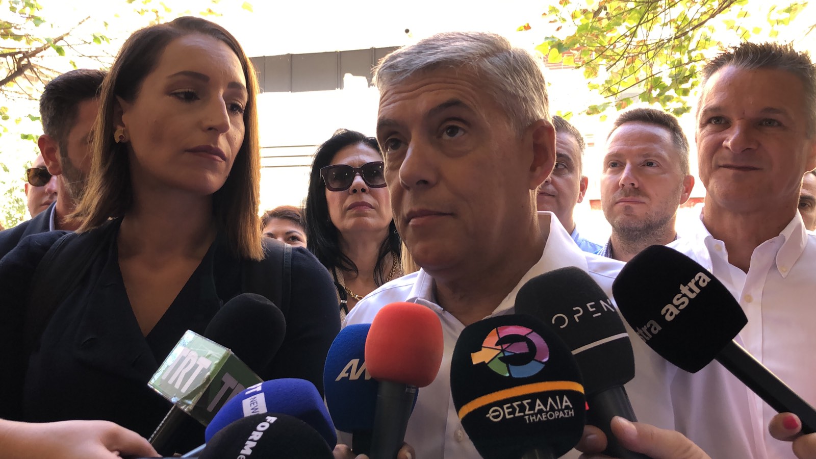Ο περιφερειάρχης στην αποχώρηση του από το 4ο Δημοτικό Σχολείο συναντήθηκε με τον υποψήφιο περιφερειάρχη Θεσσαλίας κ. Τάσο Τσιαπλέ, με τον οποίο κι αντάλλαξε χειραψία.