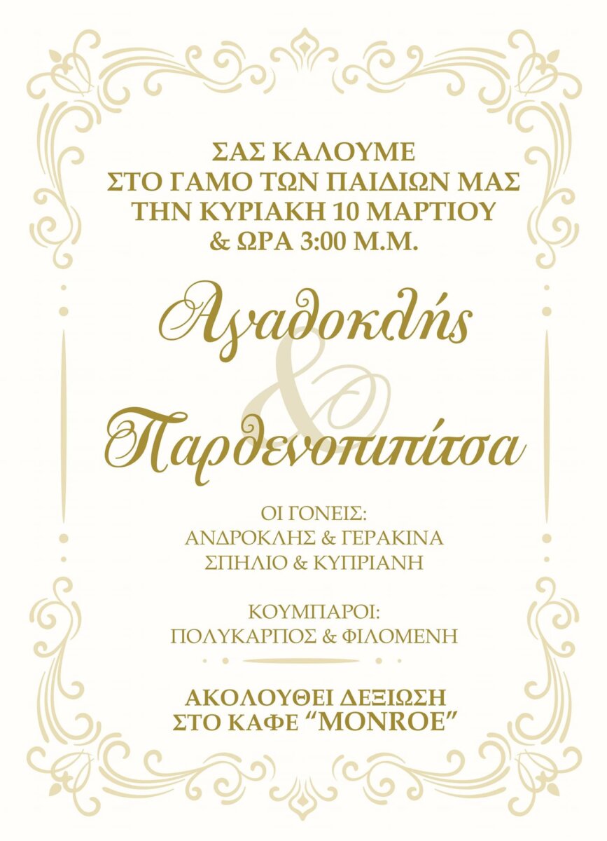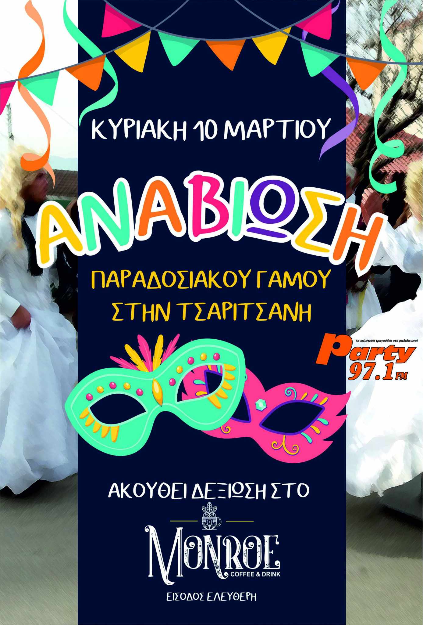 Την Κυριακή 10 Μαρτίου, ο Σύλλογος Γυναικών θα αναβιώσει μετά από αρκετά χρόνια το έθιμο του παραδοσιακού γάμου, με πρωταγωνιστές τον… Αγαθοκλή και την Παρθενοπιπίτσα, ενώ θα ακολουθήσει γαμήλια δεξίωση στο καφέ Monroe.