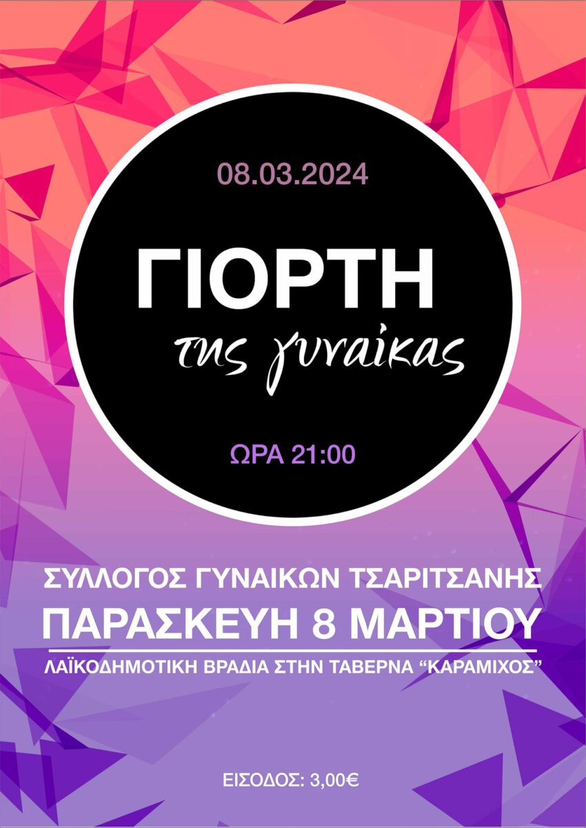 Την Παρασκευή στις 8 Μαρτίου, ο Σύλλογος Γυναικών θα τιμήσει την Ημέρα της Γυναίκας σε μια λαϊκοδημοτική βραδιά στην ταβέρνα “Καραμίχος”.