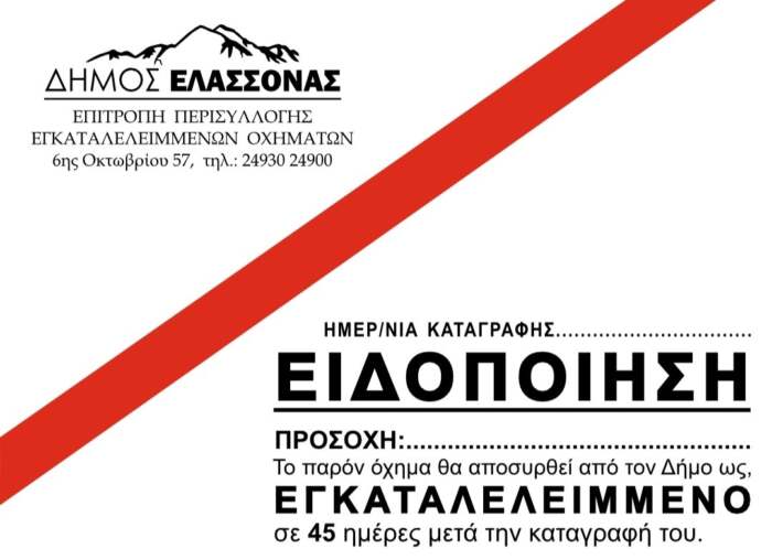 Ο Δήμος Ελασσόνας σε μία προσπάθεια αναβάθμισης του αστικού περιβάλλοντος και αποσυμφόρησης των δημοτικών οδών από οχήματα που αποτελούν εστίας μόλυνσης και αιτία πρόκλησης ατυχημάτων, εντοπίζει, καταγράφει, επικολλά ειδικό αυτοκόλλητο και μετά την πάροδο 45 ημερών περισυλλέγει και απομακρύνει τα εγκαταλελειμμένα οχήματα από τους οικισμούς του δήμου.