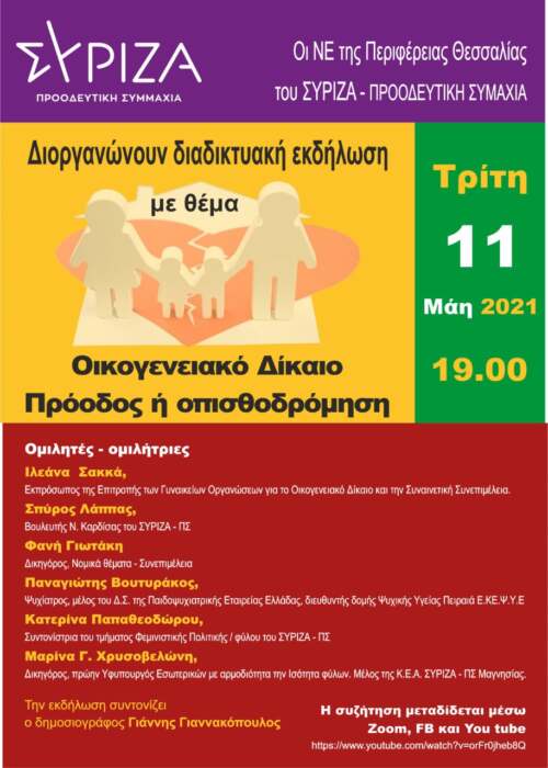 Οι Νομαρχιακές Επιτροπές της Περιφέρειας Θεσσαλίας του ΣΥΡΙΖΑ – Προοδευτική Συμμαχία διοργανώνουν διαδικτυακή εκδήλωση με θέμα «Οικογενειακό Δίκαιο: Πρόοδος ή οπισθοδρόμηση» σήμερα Τρίτη 11 Μάη 2021 στις 19.00.
