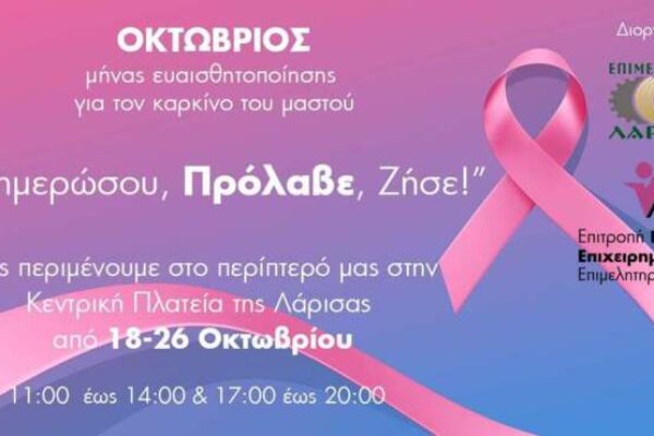 Το Επιμελητήριο Λάρισας και η Επιτροπή Γυναικείας Επιχειρηματικότητας Επιμελητηρίου Λάρισας διοργανώνει καμπάνια με ποικίλες δράσεις ενημέρωσης & πρόληψης του καρκίνου …