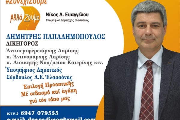 Στις Δημοτικές εκλογές ψηφίζουμε Δημήτρη Παπαδημόπουλο, υποψήφιο δημοτικό σύμβουλο στο κεντρικό ψηφοδέλτιο της Ελασσόνας, με τον συνδυασμό “Αλλάζουμε-Συνεχίζουμε”, και υποψήφιο Δήμαρχο …