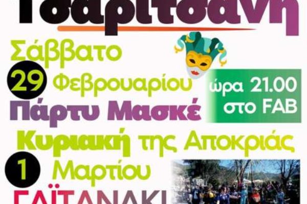 Αποκριάτικες εκδηλώσεις στην Τσαριτσάνη από τον Μορφωτικό Σύλλογο Σάββατο 29 Φεβρουαρίου Όπως και να το κάνουμε αποκριές χωρίς, χορό, κέφι, …