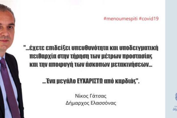 ΜΗΝΥΜΑ ΔΗΜΑΡΧΟΥ ΕΛΑΣΣΟΝΑΣ ΝΙΚ. ΓΑΤΣΑ Ελληνίδες, Έλληνες, Οι δραματικές εξελίξεις της εξάπλωσης του νέου κορωνοϊού κατακλύζουν τη σκέψη των συμπατριωτών …