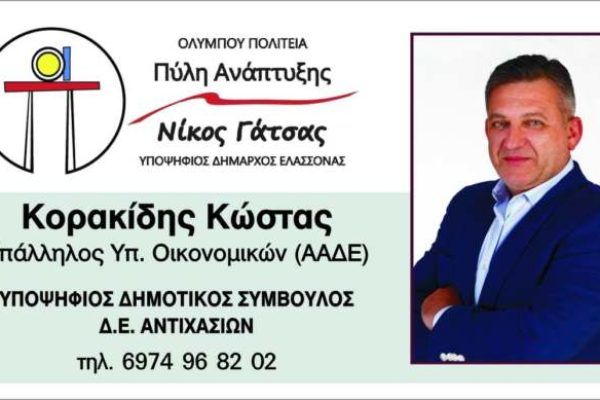 Στις Δημοτικές εκλογές ψηφίζουμε Κορακίδη Κώστα, υποψήφιος δημοτικός σύμβουλος Δ.Ε. Αντιχασίων με τον συνδυασμό “Ολύμπου πολιτεία – Πύλη ανάπτυξης” και …
