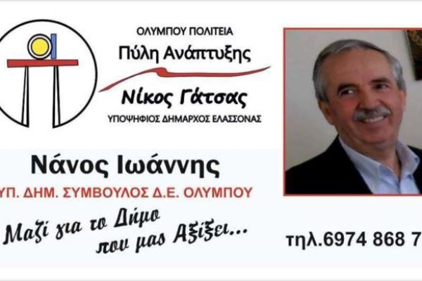 Είναι από τους πλέον δημοφιλής συνεργάτες του Υποψηφίου Δημάρχου Ελασσόνας Νίκου Γάτσα. Ο λόγος γίνεται για τον  Δημοτικό Σύμβουλο Γιάννη Νάνο, …
