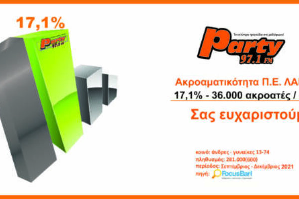 Ο Party Fm 97.1 και πάλι στην κορυφή της ακροαματικότητας με 17,1% σε όλη την Π.Ε. Λάρισας, σε όλες τις ηλικίες (13-74) με …