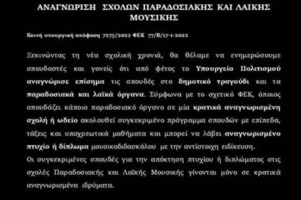 Στα πλαίσια της ενημέρωσης σπουδαστών και γονέων και προς αποφυγή οποιασδήποτε παραπληροφόρησης,  όσο αφορά τις αναγνωρισμένες μουσικές σπουδές στα ανώτερα …