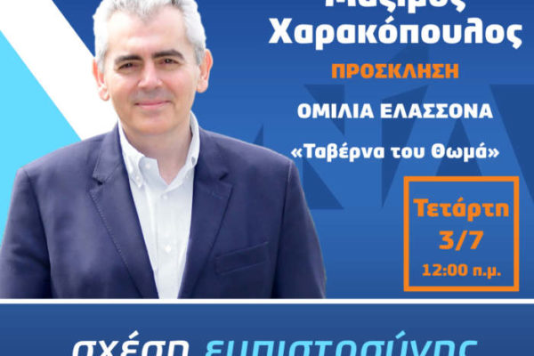 Σήμερα Τετάρτη στις 12 το μεσημέρι η ομιλία του Μ. Χαρακόπουλου στην Ελασσόνα