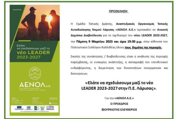 Η Ομάδα Τοπικής Δράσης, Αναπτυξιακός Οργανισμός Τοπικής Αυτοδιοίκησης Νομού Λάρισας «ΑΕΝΟΛ Α,Ε.» προσκαλεί σε Ανοικτή Δημόσια Διαβούλευση για το σχεδίασμά …