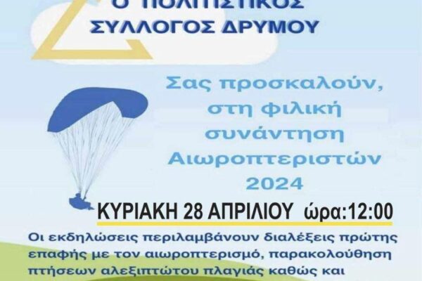 Ο Α.Σ.Ο.ΕΛ και ο Πολιτιστικός σύλλογος Δρυμού διοργανώνουν φιλική συνάντηση αιωροπτεριστων την Κυριακή 28 Απριλίου στην πίστα απογείωσης Δρυμού. Οι …