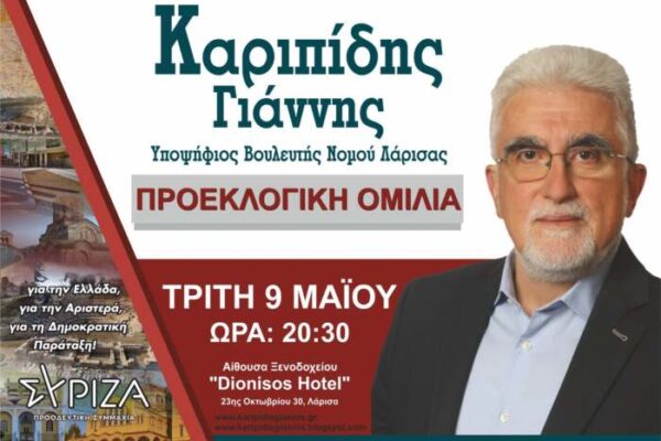 Σας καλώ στην προεκλογική μου ομιλία την Τρίτη 9 Μαΐου και ώρα 20:30 στην αίθουσα κοινωνικών εκδηλώσεων του “Dionisos Hotel”. …