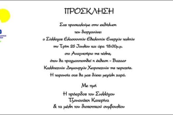 Ο Σύλλογος Ελασσονιτών Εθελοντών – Ενεργών Πολιτών, διοργανώνει σήμερα Τρίτη 26 Ιουλίου στις 6 το απόγευμα, έκθεση-bazaar καλλιτεχνών δημιουργών χειροτεχνών …